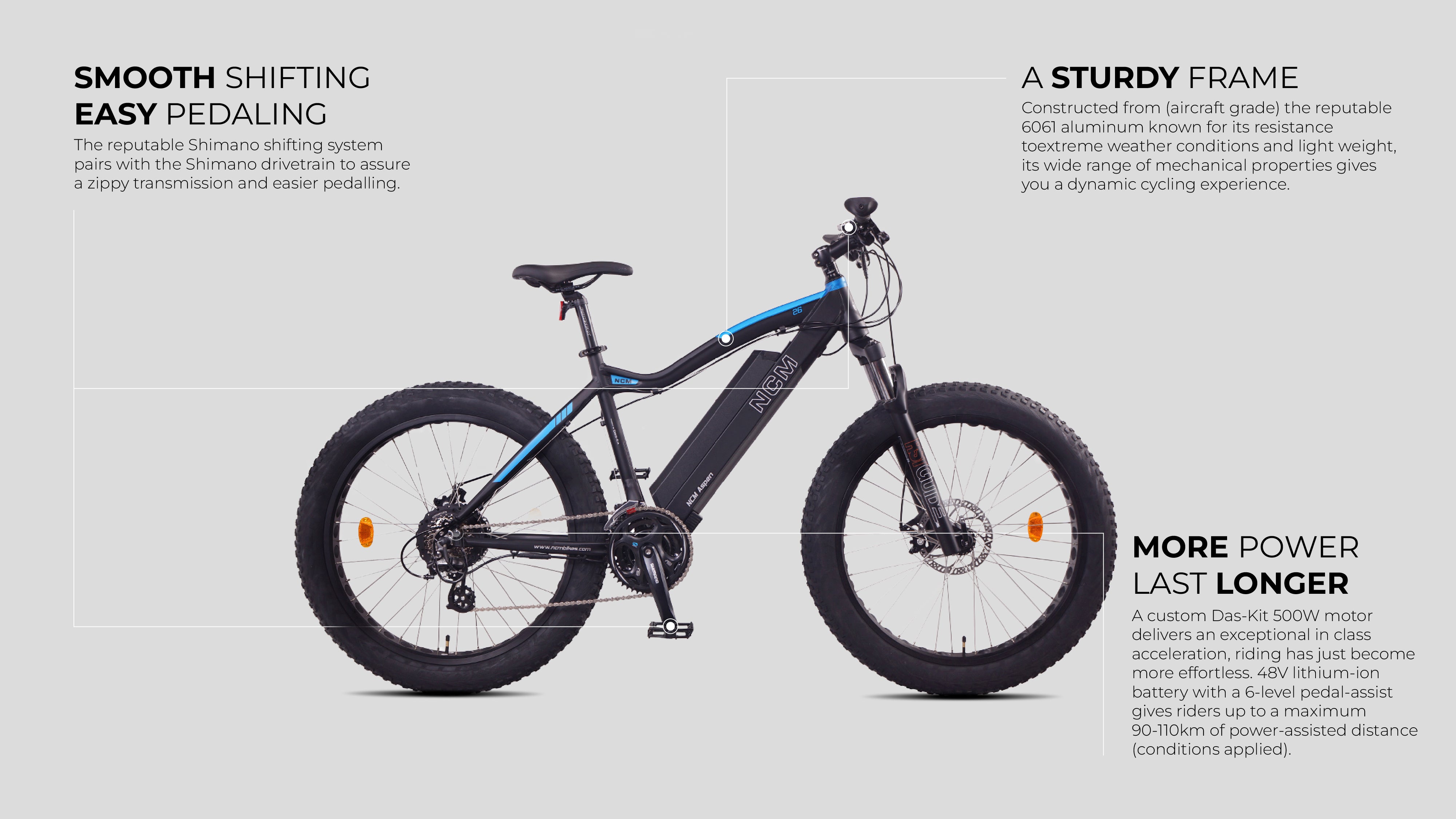 NCM Aspen is actually a specially designed sports equipment that allows people to ride in the snow like a land. The use of wide tires makes us more stable in snow riding, which allows us to enjoy the joy of snow riding. The featured and patented DAS-KIT technology gives riders a range of up to 110km (conditions applied) in a single charge. 6 levels of assisting pedalling modes meet various cycling needs. The combination of selected branded components secures this work of quality.