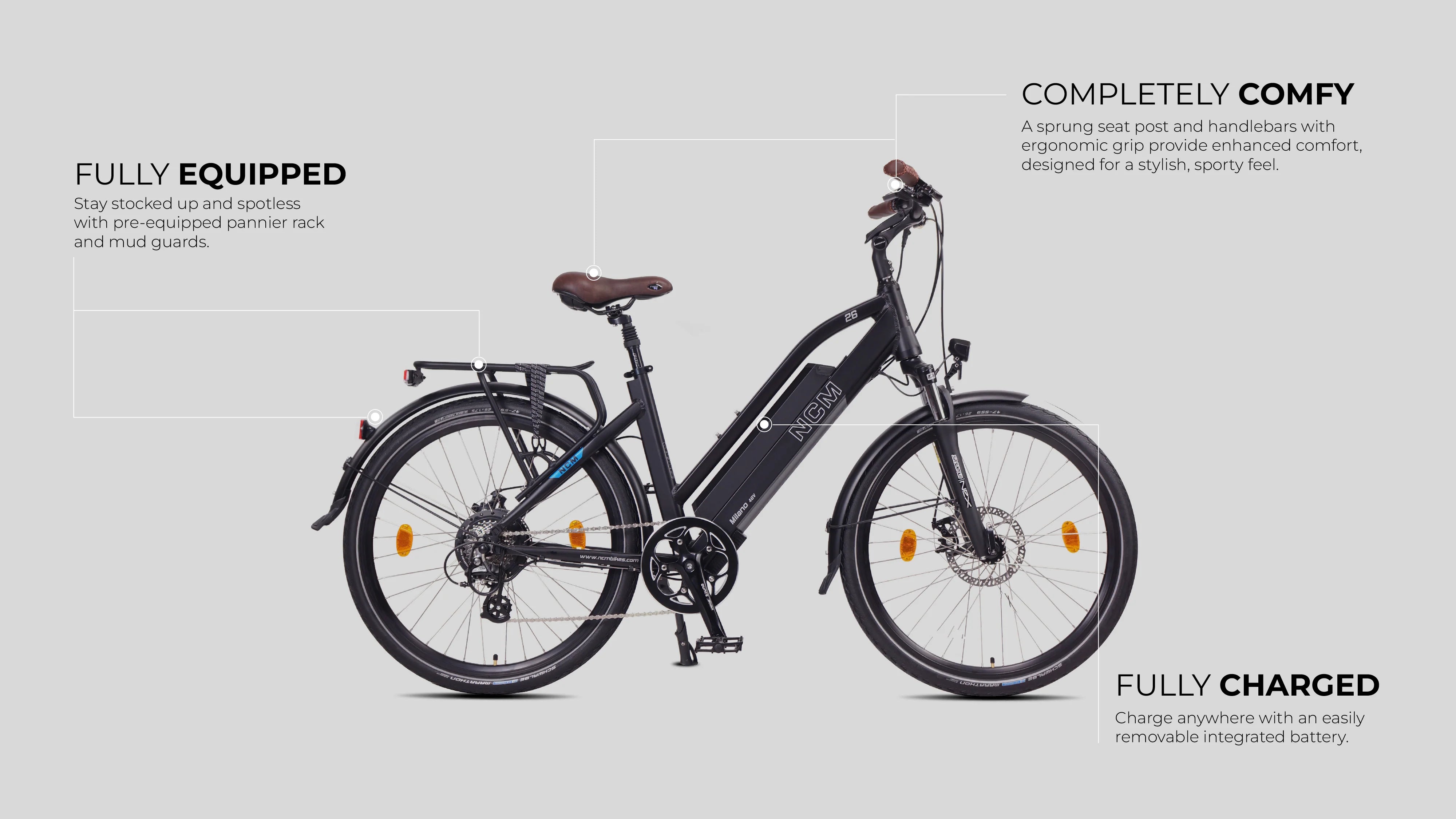 Balancing accessibility with superior specifications, the NCM Milano Plus is a step-through e-trekking bike for riders that are eager to tackle longer routes alongside their daily rides and want an e-bike with the range and the integrity to help them do it.